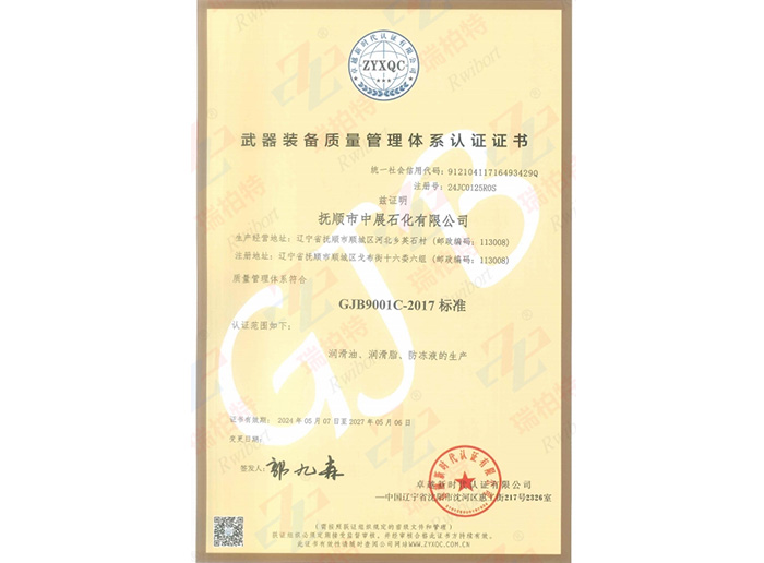 撫順市中展石化有限公司是出口外貿(mào)型企業(yè)。地處盛產(chǎn)各種石油化工產(chǎn)品的大型石化城中國遼寧省撫順市。公司下設(shè)一個生產(chǎn)廠,一個經(jīng)貿(mào)部。本公司是GB/T19001-2016/ISO 9001:2015標(biāo)準(zhǔn)質(zhì)量管理體系認(rèn)證單位(注冊號:00922Q10664R1S),是GJB9001C-2017標(biāo)準(zhǔn)武器裝備質(zhì)量管理體系認(rèn)證單位。撫順在上個世際五十年代就已是我國軍用油脂的生產(chǎn)基地,本公司正在發(fā)揚(yáng)和繼承這一優(yōu)良傳統(tǒng),全力投入于各種軍用、航空油脂的生產(chǎn)與研發(fā)。同時不斷吸納致力于航空、軍品研究的人才加盟本公司,使我們的生產(chǎn)和研發(fā)能力不斷擴(kuò)大,產(chǎn)品不斷更新。   現(xiàn)在我公司生產(chǎn)的瑞柏特牌各類軍用、航空油脂正在不斷應(yīng)用于部隊與軍工航空航天部門。公司的宗旨是:以人為本,廣交朋友,不斷進(jìn)取,不斷創(chuàng)新;視產(chǎn)品質(zhì)量為生命線,用服務(wù)鑄造百年誠信。【更多】